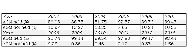 It is observed from the table 10 that the number of AGM holding companies is increasing and the AGM not holding companies is decreasing. The AGM not holding companies are 10.97% in the year 2002 and it reduced to 1.56% in the year 2013 which is positive signs. The AGM holding companies are 89.03(2002) percent and 98.43(2013) percent respectively. This scenario indicates positive movement of the market.
