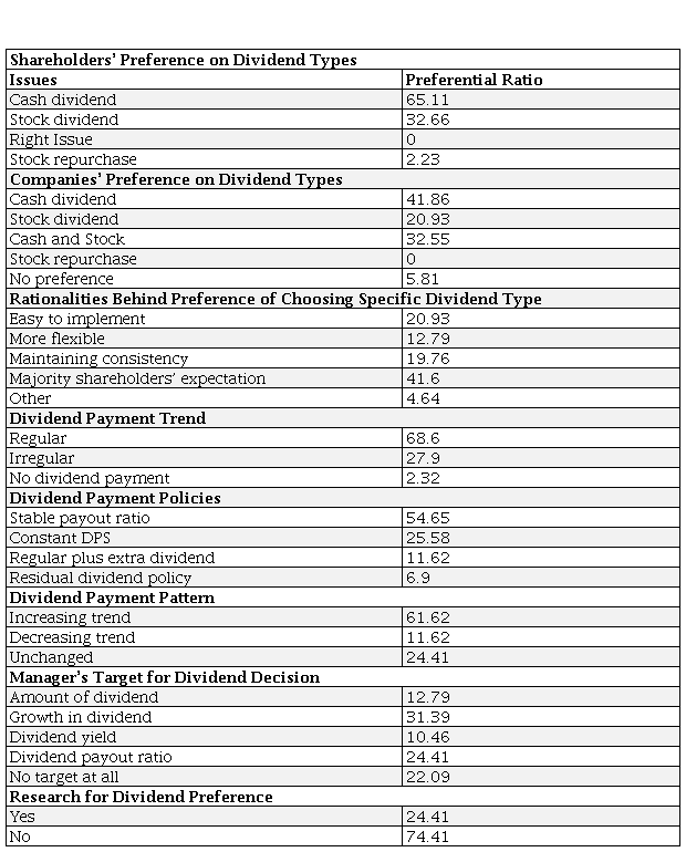 The dividend increasing trend, decreasing trend, unchanged trend is 61.62%, 11.61%, 6.9% companies respectively. The most of the company’s target the growth in dividend (31.39%) and dividend payout ratio (24.41%) and remarkable number of companies have no target at all (22.09%). Only 24.41% companies conduct research about the dividend preference of the shareholders.
