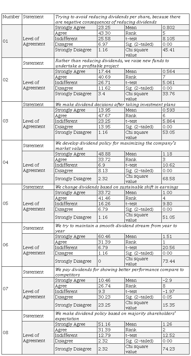Authors have used one-sample t-test to determine whether the mean response for each of the 8 factors involving dividend policy differs significantly from 0 (Indifferent).This study follows the test of Baker & Powell (2000), Brav et al. (2005), etc. The non-parametric test (Chi-square test) is also done which is similar testing tools of Edelman & Farrelly (1983).