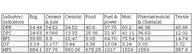 From the table 1, it is seen that the average dividend payout ratio of miscellaneous sector, engineering sector, pharmaceutical & chemical sector, ceramic, textile, food, fuel& power, Cement & jute are 63.2, 54.49, 46.98, 53.14, 43.98, 40.6, 37.76, 34.52 percent respectively which reveal that miscellaneous, engineering sector, chemical& pharmaceutical sectors have the better DPR while the food and cement, jute sector have the lower DPR.