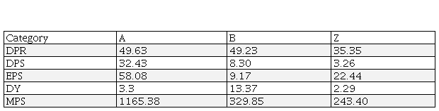 From the table 2, it is seen that the DPR, DPS, EPS, DY of A category are 49.63%, 32.43%,58.08%, 3.3% while the DPR, DPS, EPS, DY of Z category are 35.35% 3.26% -22.44% 2.29 %. The companies which are under category A have better performance in dividend payment but the companies which are under the Z category have weak position in dividend payment.