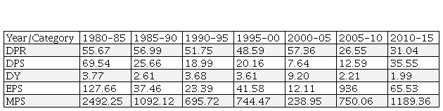 From the table 3, it is seen that the DPR of the earlier listed companies is more than the former listed companies (i.e. 1976-80: 55.67%, 1980-85:56.98%, 2000-05:26.54%, 2005-10: 31.04%). It also observed that the DPR of the companies are more which are listed before year 2000 than the companies which are listed after the year 2000. The DY of early listed companies more than the later listed companies.