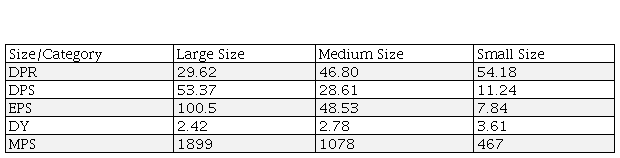 From the table 4, it is observed that the DPS of Large, medium, small size firm are 53.37, 28.60, and 11.24 respectively. The DPR of large, medium small size firm are 29.62, 46.80, and 54.18 respectively. The DPR and DPS is reverse direction because the large firm pay more stock dividend than small size firm. The EPS of large firm is 100.5 while the EPS of small firm is only 7.84. The large firm’ market price of share (1899) is more than the MPS of small size firm (467).
