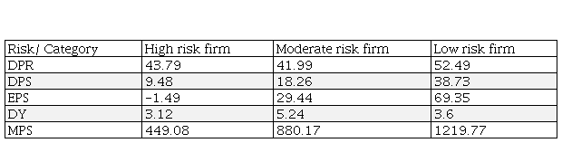 It is observed from the table 5 that the low volatile companies’ (low risk) DPR, DPS, EPS, DY, MPS are 52.49 %, 38.73%, 69.34%, 3.6%, 1219.77 respectively while the high volatile companies’ (high risk) DPR, DPS, EPS, DY, MPS are 43.79 %, 9.47%, -1.49%, 3.12%, 449.08 respectively. So, it is concluded that the high volatile companies’ performance is not satisfactory in related to market issues.