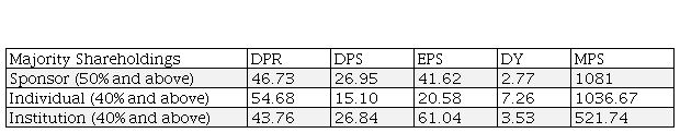 In the table 7, the dividend related performances are observed in respect of majority shareholdings position. The DPR and DY of individual ownership’ majority are 54.68% and 7.26 percent which is more than the other two groups. But the DPS and EPS of individual ownership’ majority are 15.10 and 20.58 percent respectively which are lower than the other majority groups. The sponsor ownership’ majority and institution ownership’s majorities are same in respect of dividend and other market related issues and have better performance.
