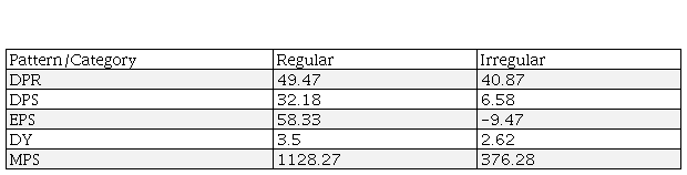 In the table 8, The DPR, DPS, EPS, DY, MPS of regular dividend paid companies are 49.46 %, 32.17%, 58.33% 3.5 %, 1128.27 respectively while DPR, DPS, EPS, DY, MPS of iregular dividend paid companies 40.87, 6.58, -9.46, 2.62, 376.28 respectivley. This shows the remarkable difference between the regular paid and iregular dividend paid companies. The performance of dividend paid companies better than the iregular dividend paid companies in the dividend and market related issues of the companies.