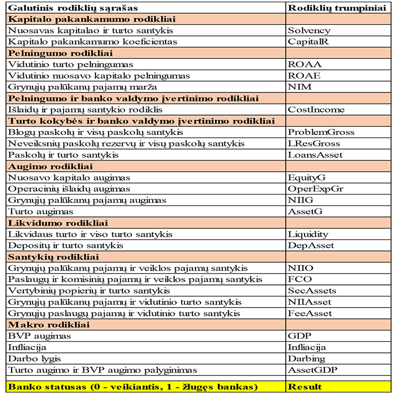 Galutinį rodiklių sąrašą sudarė 24 kintamieji (rodikliai), suskirstyti į 8 kategorijas, t.y. viena kategorija („Santykių rodikliai“) daugiau nei ekspertų pateiktame rodiklių sąraše. Makro rodiklių kategorijai priklauso 4 kintamieji rodikliai, iš kurių turto augimo ir BVP augimo palyginimo kintamasis yra išvestinis: jo reikšmė yra 1, kai banko turtas augo greičiau negu šalies BVP, ir atvirkščiai 0, kai banko turtas augo lėčiau negu šalies BVP.
