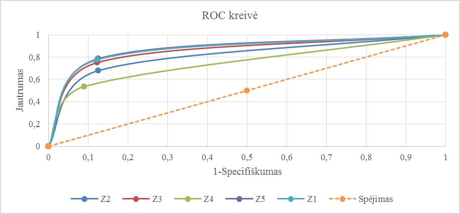 Sugeneravus 5 logistinės regresijos modelius, buvo siekiama grafiškai pavaizduoti modelių tikslumą. Pagal 2 paveiksle pateiktas ROC kreives galima teigti, kad visų funkcijų prognozavimo kokybė yra geresnė už atsitiktinį spėjimą.