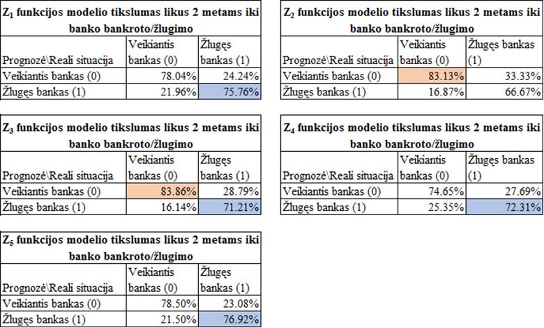 Iš 2 paveikslo grafikų matyti, kad geriausia prognozavimo kokybe pasižymi Z5, Z1 ir Z3 modeliai. Išanalizavus funkcijų charakteristikas matyti, kad didžiausią McFadden R2 ir mažiausius Akaike informacijos, Schwarz kriterijus sugeneravo Z3 funkcijos modelis, kurio tikslumas likus vieniems metams iki banko žlugimo siekia 75%, kai P>0,1. Tačiau atsižvelgiant į modelio apmokymo procesą ir modelio tikslumą, padaryta išvada, kad pranašesnis yra Z5 modelis: likus 1 metams iki banko žlugimo jis 78,57% tikslumu identifikuoja žlungančius bankus ir 87,46% tikslumu identifikuoja sėkmingai veikiančius bankus.