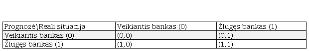 I rūšies klaida laikoma, kai modelis prognozuoja, kad bankas yra žlugęs ar žlungantis, nors iš tiesų yra veikiantis (1,0), II rūšies klaida - kai modelis prognozuoja, kad bankas yra veikiantis, nors iš tiesų yra žlugęs (0,1). Šios klaidos nėra lygiavertės, nes II rūšies klaida yra pavojingesnė (neidentifikuojama reali grėsmė), todėl modelio tikslumas buvo vertinamas pagal sugeneruotų II rūšies klaidų kiekį.