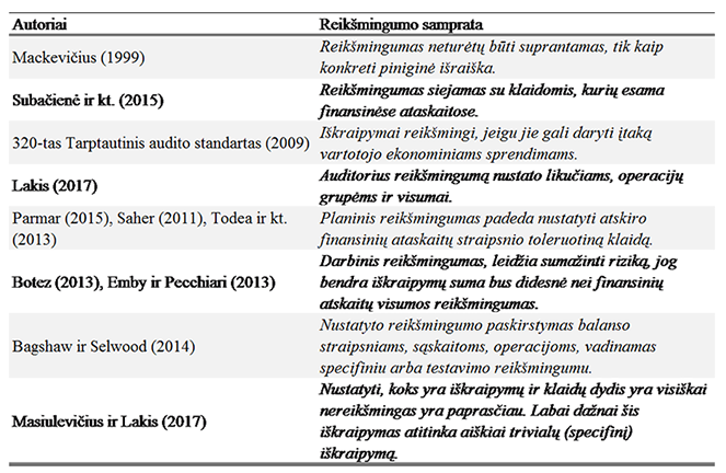 Apibendrinant galima teigti, jog reikšmingumas analizuojamas įvairiame kontekste, tačiau dažniausiai yra siejamas su didžiausia leistina klaida. Dažniausiai yra pabrėžiama, jog informacija yra reikšminga, kuomet jos klaidingas pateikimas arba nepateikimas paveikia suinteresuotų šalių ekonominius sprendimus. Be to, tiek užsienio, tiek lietuvių autoriai išskiria tris reikšmingumo tipus (1 lent.): bendrąjį (planinį, preliminarų) reikšmingumą visos finansinės atskaitomybės lygiu, darbinį reikšmingumą - ūkinių operacijų grupėms (mažesnį už bendrąjį) bei aiškiai trivialų iškraipymą, t. y. reikšmingumo paskirstymą konkretiems sąskaitų likučiams, straipsniams, operacijoms ir panašiai.