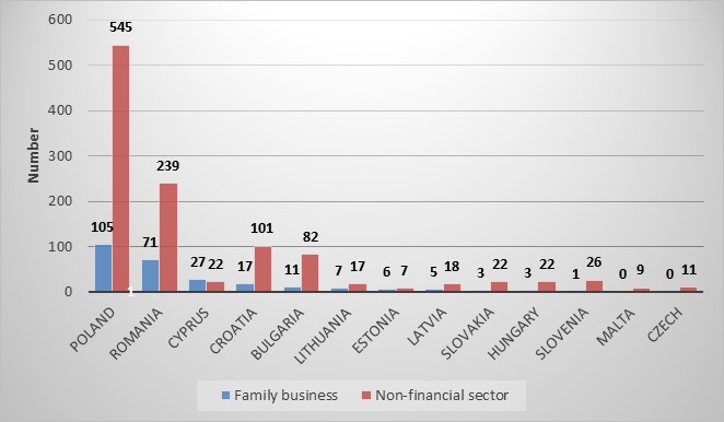 Figure 3 presents the number of family-controlled firms and all non-financial firms that are in regulated markets. Cyprus regulated market has larger number of family firms than non-family firms, the most family-controlled businesses are in Poland (105) and Romania (71).