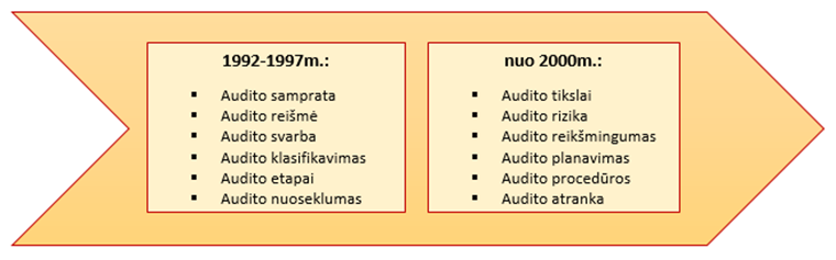 Raziūnienė (2012) tyrė audito įrodymų srities mokslinių tyrimų objektus 1992 – 1999 m. laikotarpio Lietuvos mokslo darbuose ir nustatė, kad juose daugiausia dėmesio buvo skiriama audito reikšmės ir svarbos, klasifikavimo, etapų bei nuoseklumo pagrindimui. Tuo tarpu vėlesniuose, 2000 – 2010 m. darbuose, buvo analizuojami audito tikslai, rizika, reikšmingumas, planavimas, procedūros, atranka (žr. 1 pav.). Šių klausimų kontekste audito įrodymų problema tampa vis reikšmingesnė ir svarbesnė (Raziūnienė, 2012).
