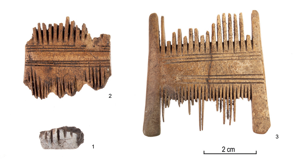 Photo by Heidi Luik.One burnt fragment has parallel sawn lines (Fig. 9: 1). It may be a fragment of a simple double comb, similar to those found for example from the Valjala hill fort in Saaremaa and Otepää in South-East Estonia (Fig. 9: 2, 3; e.g. Luik, 1998, p. 47–58, fig. 24–29). Fragments of burnt bone combs have been found from some cremation burials in Saaremaa and West Estonia (Luik, 2003, p. 159–160, fig. 4). Double one-piece combs have been often made of antler, so it is possible that the fragmentary item from Tornimäe is also from antler, but since the object is burned, it is not certain.
