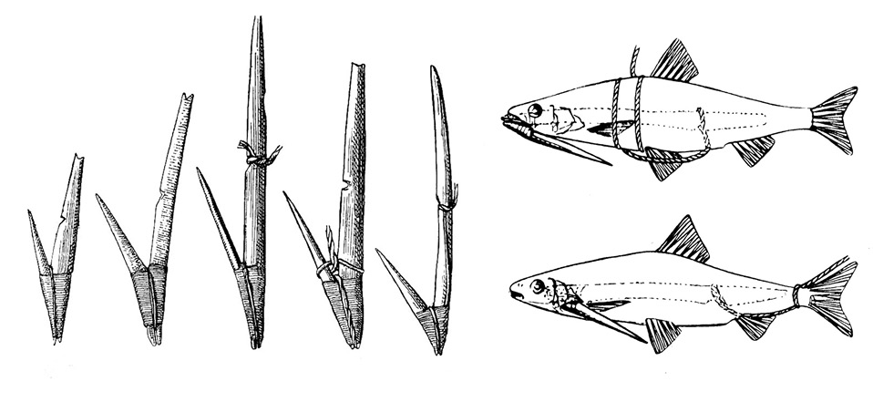 In Finland composite wooden and bone fish hooks were used still in the end of the 19th century and the beginning of the 20th century (Fig. 11). The stem of the hook was usually made of wood, but the hook was either from wood (e.g. juniper), bone, but also from copper or iron wire (Sirelius, 1906, p. 90–92, fig. 207–208; Brinkhuizen, 1983, p. 13–15, fig. 8). In some case both the stem and the hook were made from bone (Sirelius, 1906, fig. 207: g). Small fish was attached to the hook as a bait (Fig. 11); according to Sirelius such hooks were used for catching burbot (Lota lota), pike (Esox lucius), pikeperch (Sander lucioperca) and salmon (Salmo salar) (Sirelius, 1906, p. 92, fig. 240: d, 241: a–c). As mentioned above, bones of two of these species – pike and pikeperch – are also represented among fish bones found in Tornimäe. Presumably similar hooks were used also in the Viking Age – the small points found from Tornimäe suit well to be parts of such composite fish hooks. If the stem was made from wood, the small bone point would be the only part to preserve from such a hook.