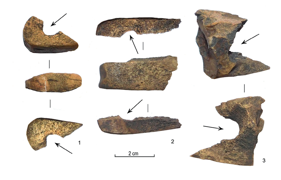 13 pav. Spėjamų pačiūžų fragmentai: arklio plaštakos kaulo (1) (AI 6688: L 696), galvijo plaštakos kaulo (2) (AI 6688: L 775), arklio pėdos kaulo (3) (AI 6688: L 876). Rodyklėmis pažymėtos pačiūžų galuose buvusių skylių žymės.