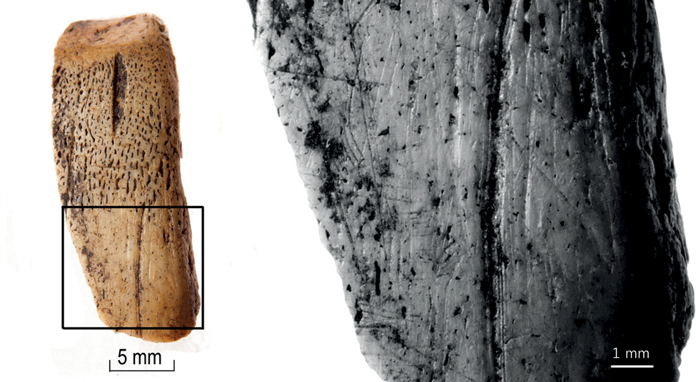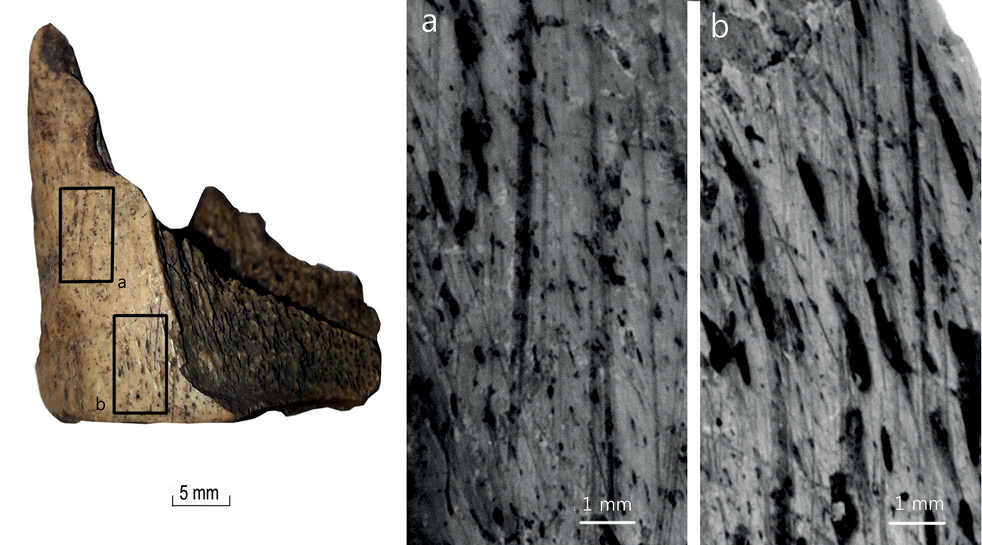 Photo by Heidi Luik.Bone fragments with working traces indicate that bone artefacts were made at the site. The number of such working waste is still quite small. The bone artefacts found in Tornimäe are rather simple items which do not require special skills from the bone worker and could have been made by the users of these artefacts. Almost all waste is bone fragments, only one is a tooth with cutting traces and one is a piece of antler. Since most worked bones are preserved very fragmentarily it was possible to identify only a few of them. Most of the identified bones are fragments of long bones: metatarsals and metacarpals. A radius and a mandible were also identified. In five cases the species of cattle and in two cases horse has been identified. Other long bone fragments also come from the bones of large herbivores, most likely cattle. The mentioned mandible fragment is a cattle left lower mandible coronoid process (Processus coronoideus). One worked fragment is a caprine bone. It is not possible to identify the antler fragment, but most likely it is elk antler.