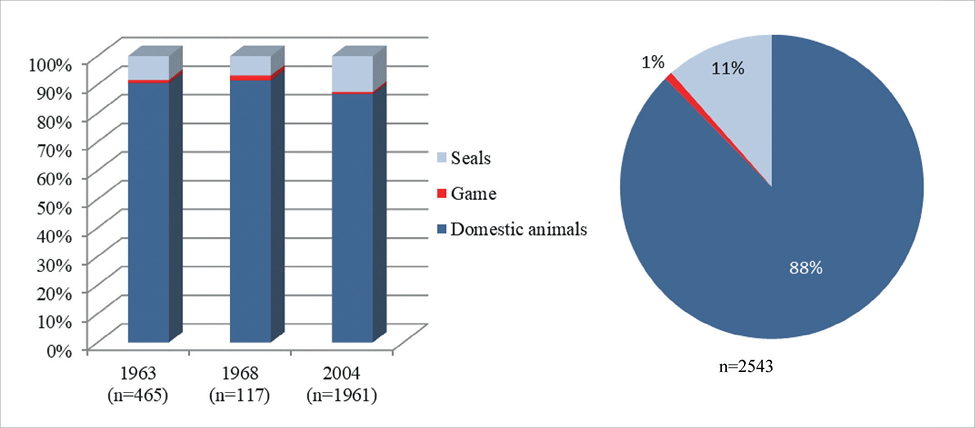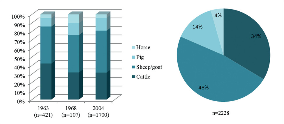 Ratio of domestic animal bones in 1963, 1968 and 2004 (left) and total (right). Figure by Liina Maldre.