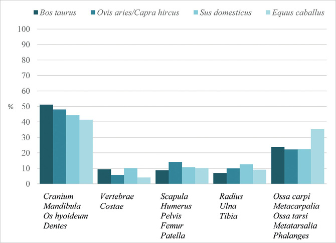 The analysis of the anatomical composition of domestic animal bones in Tornimäe shows that all body parts are represented. Skeletal elements are presented in five groups on the graph: bones of head, bones of trunk, bones of the proximal part of limbs, bones of the middle part of limbs and bones of the distal part of limbs (Fig. 5). The significant predominance of the bones of the head area is due to the large number of teeth, which is characteristic of the fragmented material. Thus, it is a typical settlement material consisting of both food and slaughter waste.