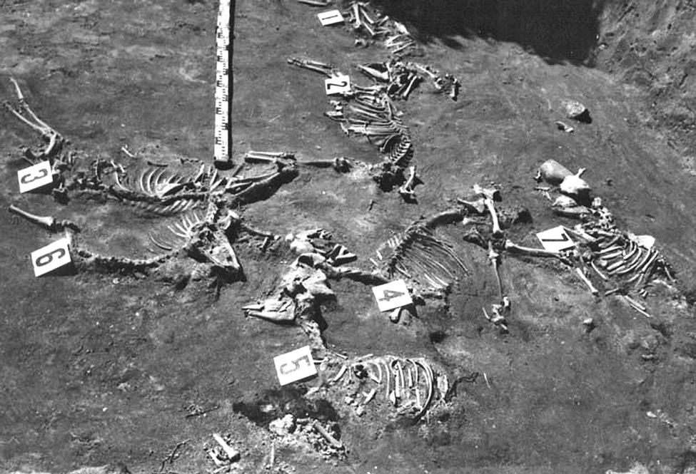 In the early 1970s another foreign researcher – Valentina Danilchenko, a Candidate of Biological Sciences from the Moscow Archaeological Institute, who periodically travelled to Vilnius – began to study the faunal remains found at the Lithuanian hillforts during the excavations in the 1960s. In 1973 she published the “List of osteological finds from the excavated Lithuanian hillforts and settlement sites” in which she presented the results of her analyses of animal bones from various settlement sites and hillforts. Right up until 1990 V. Danilchenko studied the animal bones collected at various hillforts (Bražuolė, Bradeliškiai, Imbarė, Maišiagala, Narkūnai, Kumelionys and others) as well as Kernavė, Vilnius Lower Castle and Stone Age sites of Donkalnis and Šventoji (Danilčenko, 1973; Danilčenko, 1989;Danilčenko, 1990). According to Dr. Aleksiejus Luchtanas, who extensively excavated the medieval town and hillforts at Kernavė, V. Danilchenko used to describe the animal bones very meticulously and measured them. Regrettably, the reports of her analyses, as is common for the works of that period on the whole, are very laconic and brief; usually, she presented the concise species composition of the animal bones, indicated the number of individuals and sometimes dedicated a few lines to specify the age of some animals. The zooarchaeological finds studied by her from Maišiagala hillfort, where, apart from isolated animal bones, twelve skeletons of domestic animals (mostly sheep) were uncovered (Fig. 1), are exceptionally interesting. These animals died in the second half of the 14th c. after the troops of the Teutonic Order set fire to the castle which stood there (Danilčenko, 1973; Volkaitė-Kulikauskienė, 1974). However, the report of the analysis is again oriented towards the bones’ species composition. Almost all zooarchaeological finds from the hillforts studied by V. Danilchenko are now lost (more on that later in this paper). In addition to the already mentioned researchers, the analyses of zooarchaeological finds from several Stone Age sites were carried out by a docent of Vilnius University (VU) zoologist Augustinas Mačionis (Daugnora, Girininkas, 1996, 59–60; Butrimas, 1985, 31) and the archaeologist Darius Duoba (Duoba, Daugnora, 1994).