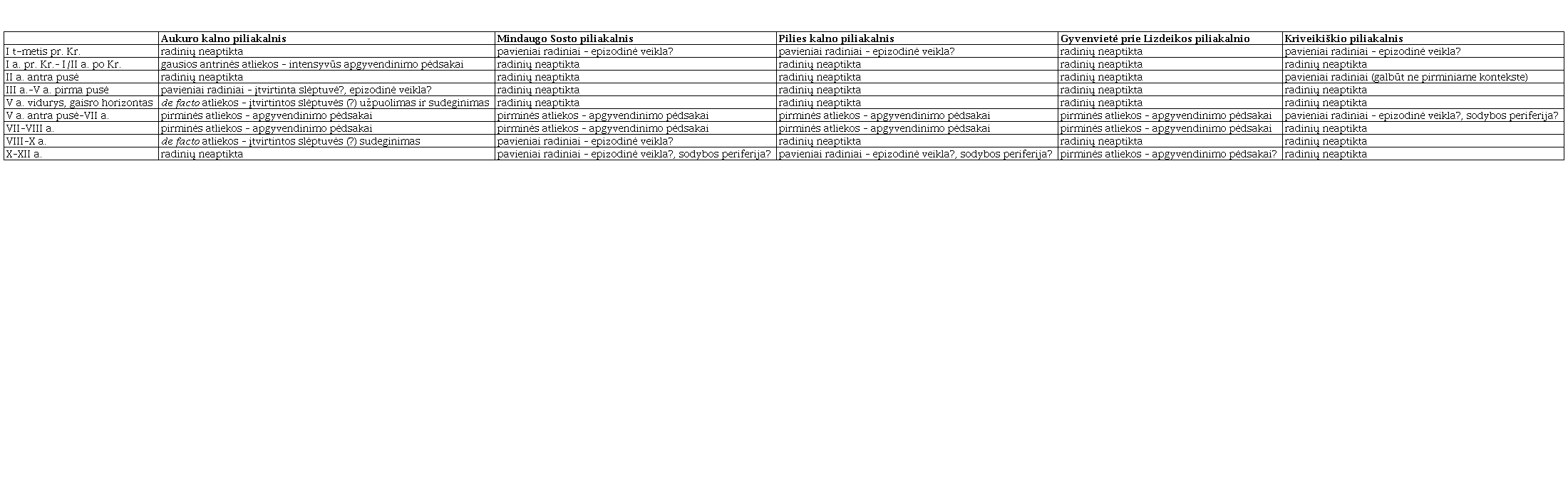 V a. vidurys, gaisro horizontas. Šiam horizontui priskirtina ankstyvoji grublėtoji keramika, turinti jau kai kurių vėlyvosios grublėtosios keramikos požymių. Jos aptikta tik Aukuro kalno piliakalnyje. Čia surinkta apie 300 šios keramikos šukių, kurių beveik visos priklauso tik dviem puodams – vieno puodo šukės koncentravosi plote Nr. 1, kito – plote Nr. 2. Abiejų puodų šukės įvairaus dydžio, be apsitrynimo požymių, o vieno iš jų dar ir su smarkaus perdegimo požymiais. Dalis šio horizonto keramikos perdegusi taip, kad keramikos masė visiškai deformavusis ir išporėjusi. Nors dėl netikslios keramikos fiksacijos dabar nebeįmanoma nustatyti, kaip šukės buvo išsibarsčiusios, ar sudarė lizdus, visi požymiai rodo, kad tai turėtų būti de facto atliekos. Į tą patį kontekstą su šiomis šukėmis patenka ir aptikti 14 trisparnių strėlių antgalių, pagal kuriuos šio gaisro horizonto chronologija ir susiaurinama iki V a. vidurio (Kazakevičius, 2004, p. 28 – 39; Bitner-Wróblewska, Kontny, 2005, p. 104 – 107). Kaip minėta, aptikta ir kitų radinių, susijusių su šiuo antpuoliu – keletas žmonių kaulų, ginklų fragmentų. Mūsų nuomone, greičiausiai į tą patį kontekstą reikėtų įtraukti ir minėto pastato aikštelės pakraštyje sudeginimą. Pastato liekanos rodo aiškų jo sunaikinimą per gaisrą (Luchtanas, 1994a, p. 19 – 20), o pagal šiame piliakalnyje aptiktus radinius jokio ryškesnio gaisro, datuojamo ankstesniu nei šis laikotarpiu, išskirti nėra pagrindo.