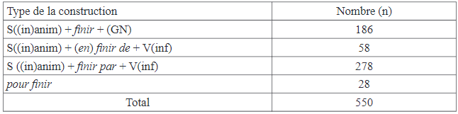 Le dictionnaire TLFi donne un aperçu exhaustif des significations de finir mais la plupart des exemples datent de la première moitié du XX ième siècle ou ils sont plus anciens et les fonctions des constructions sont vaguement définies. Dans cette étude on analysera les fonctions de 4 types de constructions du français écrit datant de l’époque plus récente (les années 1960–2010) qui sont présentées dans le tableau 2 avec le nombre d’occurrences :