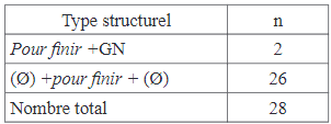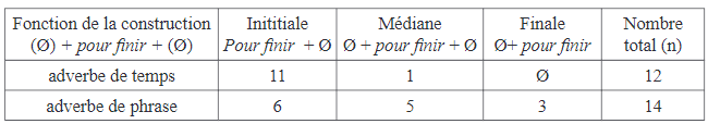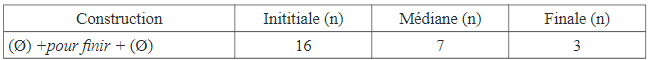 Les exemples prouvent donc que la construction pour finir sert à marquer le temps et structurer l’ordre du discours. Elle est majoritairement utilisée en position frontale de phrase ou de proposition (le tableau 5).