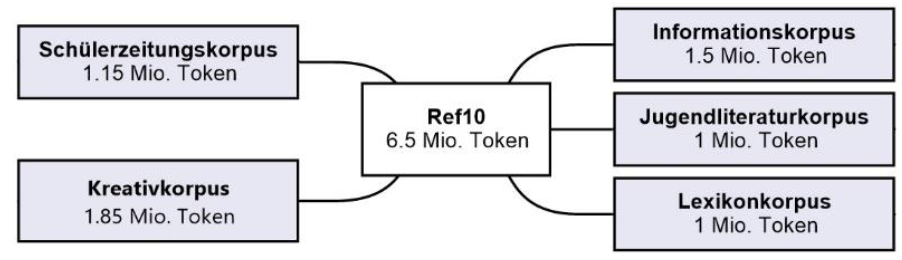 Das zugrundeliegende Korpus Ref10 wurde im Rahmen des Projektes Wortschatzwissen. Ein Referenzwortschatz für die Sekundarstufe I5 aufgebaut. Das Korpus umfasst derzeit ungefähr 6,5 Millionen Token (Stand: 02.04.2020) und enthält Texte, die entweder Jugendliche ungefähr im Alter von 11–16 Jahren (Sekundarstufe I) adressieren oder von ihnen selbst geschrieben sind. Das Korpus Ref10 teilt sich insgesamt in fünf Subkorpora auf (siehe Abb. 1).