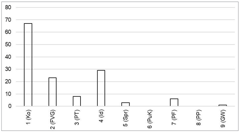 Die meisten Phraseme konnten der Kategorie 1 (Kollokationen) zugeordnet werden, dies waren insgesamt 67 Phraseme. 29 Phraseme wurden der Kategorie 4 (Idiome) und 23 der Kategorie 2 (Funktionsverbgefüge) zugeordnet.