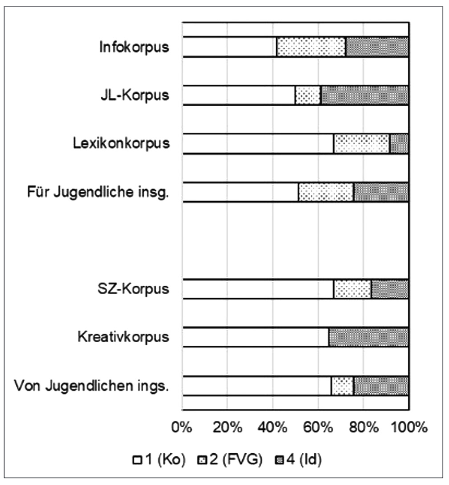 Man kann beobachten, dass die Verteilung der Funktionsverbgefüge in den verschiedenen Subkorpora variiert. In den zwei Subkorpora mit einem ausgewogenen Kollokation-Idiom-Verhältnis konnten entweder keine (Kreativkorpus) oder nur wenige (JL-Korpus) Funktionsverbgefüge identifiziert werden. Bei der Stichprobe des Kreativkorpus handelt es sich um einen Blogbeitrag und einen Reisebericht, beide wurden von Jugendlichen geschrieben. Die Stichprobe des JL-Korpus umfasst kurze Ausschnitte zweier Jugendromane, die im Schulunterricht behandelt werden. In der Stichprobe des Informationskorpus, bei dem die Stichprobe einen Ausschnitt eines Magazins für Berufsanfänger und Ausbildungsinteressierte umfasst, und des Lexikonkorpus konnten hingegen besonders viele Funktionsverbgefüge, in Zahlen elf und sechs, identifiziert werden.