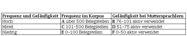Die Ergebnisse der beiden Untersuchungen mündeten in die Einteilung der untersuchten Phraseme in neun verschiedene Gruppen. Es ergeben sich zunächst zwei Dimensionen: Frequenz im Korpus und Geläufigkeit bei Muttersprachlerinnen und Muttersprachlern. Diese werden in drei Grade aufgeteilt: niedrig (weniger als 100 Belegstellen im Korpus bzw. von 0–50 Teilnehmende der Geläufigkeitsstudie aktiv verwendet), mittel (100–500 Belegstellen bzw. von 51–75 T. aktiv verwendet) und hoch (über 500 Belegstellen bzw. von 76–101 T. aktiv verwendet) (vgl. Hallsteinsdóttir, Šajánková & Quasthoff 2006, 126) (s. Tab. 1).