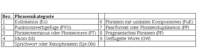 Zur Beantwortung der oben formulierten Forschungsfragen wurde zuerst deduktiv, auf Basis von theoretischer Forschung zur Klassifikation von Phrasemen, ein Kategoriensystem entwickelt, das die Grundlage der explorativen Datenanalyse einer Stichprobe des Korpus Ref10 darstellt.