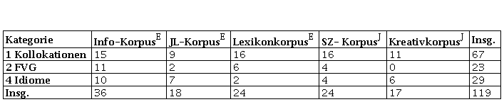 Im Informationskorpus kommen die meisten Phraseme vor, wobei die Kategorien ausgeglichen sind, die Kollokationen sich hier aber besonders zu häufen scheinen. Die anderen Subkorpora sind nicht auf diese Weise ausgeglichen, hier ist der Überhang zu Kollokationen auffällig. Die Ausnahmen stellen hier das Kreativkorpus und das Jugendliteraturkorpus dar. Mit elf Kollokationen, aber sechs Idiomen im Kreativkorpus und neun Kollokationen im JL-Korpus zu sieben Idiomen sind hier relativ ausgewogene Verhältnisse vorzufinden.