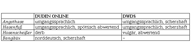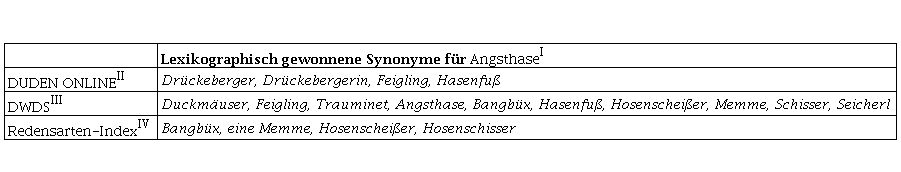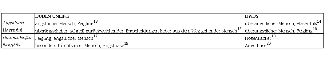 Die Gruppe der die Ängstlichkeit benennenden Einwortidiome wird anhand von Online-Nachschlagewerken festgelegt, indem von dem Einwortidiom Angsthase, als ‚ängstlicher Mensch, Feigling’6 definiert, ausgegangen wird. Im weiteren Schritt werden in Anlehnung an lexikographische Quellen seine Synonymkandidaten zusammengestellt, die in der nachfolgenden Tabelle angeführt werden.