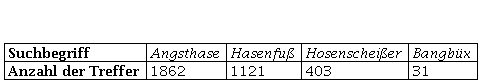 Um an die endgültige Gruppe der zu untersuchenden Einwortidiome zu gelangen, werden erstens aus den lexikographisch gewonnenen Synonymen für das Wort Angsthase Simplizia (d. h. Memme) und Derivate (d. h. Feigling, Schisser, Seicherl) ausgeschlossen. Zweitens werden im Weiteren nur Komposita berücksichtigt, deren Konstituenten lexikalisiert sind und zu Appellativa gezählt werden. Auf diese Art und Weise werden aus dem Korpus solche Zusammensetzungen wie Duckmäuser, das aus nicht-lexikalisierten Elementen besteht (vgl. Motsch 2004, 50), oder Drückeberger / Drückebergerin, dessen Zweitglied ein Familienname ist (vgl. Lohde 2006, 86), ausgeklammert. Diese Vorgehensweise, in der folgenden Untersuchung auf Komposita aus nicht-lexikalisierten Konstituenten und mit onymischen Gliedern zu verzichten, wird durch die Annahme motiviert, dass die wörtliche Bedeutung der Komponenten der Einwortidiome ihre Verwendungsprofile im Wesentlichen determinieren kann. Aus der Untersuchung wird außerdem das Kompositum Hosenschisser ausgeschlossen, das weder im DUDEN ONLINE noch im DWDS verzeichnet ist. Die so herausgefilterte Synonymgruppe und der Suchbegriff Angsthase werden der Analyse unterzogen, wobei sie zunächst im Hinblick darauf geprüft werden, welche Frequenz sie im DeReKo11 aufweisen12. Die herausgefundenen Zahlen sind in der nachfolgenden Tabelle zusammengestellt.