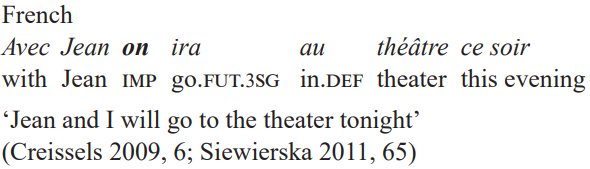 Siewierska, Anna. 2011. Overlap and complementarity in reference impersonals. In Impersonal constructions. A cross-linguistic perspective. Andrej Malchukov & Anna Siewierska, eds. Amsterdam: John Benjamins. 57–89. https://doi.org/10.1075/slcs.124.03sie