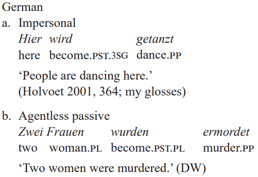 Holvoet, Axel. 2001. Impersonals and passives in Baltic and Finnic. In Circum-Baltic languages. Volume 2: Grammar and Typology. Östen Dahl & Maria Koptjevskaja- Tamm, eds. Amsterdam/Philadelphia: John Benjamins. 363–389. https://doi.org/10.1075/slcs.55.04hol