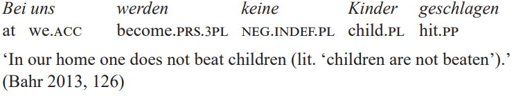 In European languages, R-impersonals are expressed by a variety of constructions (Siewierska 2011, 58): pronominalized forms of the numeral ‘one’, as in English oneor Italian uno; impersonal pronouns such as German man and French on; personal pronouns used non-referentially, such as the English they in (4b) above and you in (6b) and zero- subject constructions like the obligatory ellipsis of the third person plural pronoun in Italian (7b); indefinite pronouns such as English someone or, finally, morphological impersonals such as the Romance reflexive impersonal or the German impersonal passive (8).