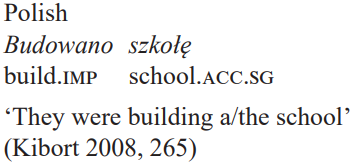 In the remainder of this paper, I will not take into account agentless passives. These fall into the definition of impersonal constructions by virtue of their agent-demoting function: as Malchukov & Ogawa (2011, 36ff.) notice, agentless passives have a very broad functional range, cross-cutting the domains of A-, T- and R-impersonals. However, syntactically they are personal, as the semantic patient is the syntactic subject and triggers verbal agreement (when the language has it, cf. German example 12). In participial-imp such as the Lithuanian ma/ta-imp, on the other hand, the patient does not trigger agreement and it can even be encoded as a syntactic object in the accusative case: the two constructions are therefore to be kept apart. Similarly, in Polish, the no/to impersonal construction has always an active alignment, with the object in the accusative case (13)3: thereby, in Polish impersonal and agentless passive are both morphologically and syntactically distinct.