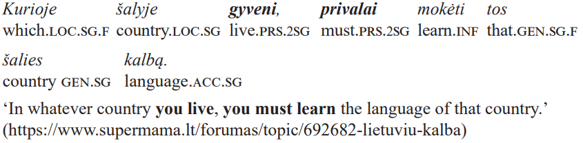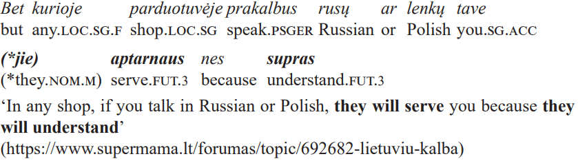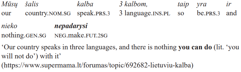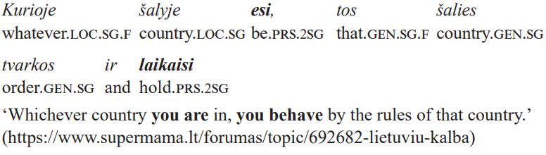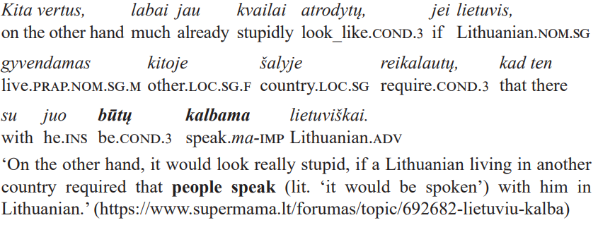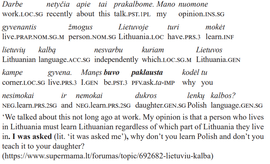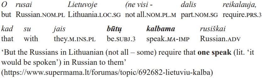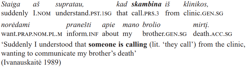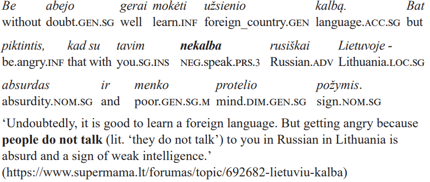 In my corpus, non-referential indefinite, generic agents (‘anyone’) are always coded either by 2sg-imp or ma/ta-imp (22, 23), while referential indefinite agents (‘someone’) are coded only by 3-imp (24). In (22) and (23) the referent is generic: anyone would/ should behave in the same way in that situation (learning the country’s language, speak in Lithuanian). In (24), on the other hand, the speaker does not know who exactly is calling, but the pool of possible referents is limited to the employees of the clinic.