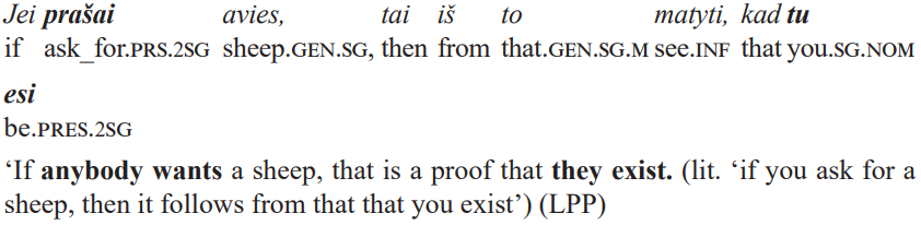 In Lithuanian, 2sg-imp and 3-imp are formally identical with the respective deictic forms. However, in 3-imp the pronouns jie/jos ‘they.m/f’ must be dropped (14): overt 3pl pronouns are always interpreted referentially. On the other hand, the pronoun tu ‘you.sg’, while being usually dropped, can also be retained: in (15), both the pronoun-less form prašai ‘ask for.2sg’ and the pronoun tu in tu esi ‘you are’ are found.