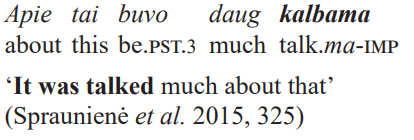 The ma/ta construction has also developed a further function, namely evidential/ inferential (see Wiemer 2006; Usonienė & Šinkūnienė 2017). In their evidential function, ma/ta participles require an overt agent, which may not be human, and cannot have an overt auxiliary (20, 21): these requirements differentiate the evidential from the impersonal construction, where the agent must be covert and semantically human. It must be remarked, however, that the evidential function of ma/ta-imp is very limited in contemporary Lithuanian: “the evidential -ma/-ta construction is actually obsolete in modern Lithuanian discourse; it is occasionally used in specific contexts and it is nearly restricted to one verb, namely būti ‘be’” (Usonienė & Šinkūnienė 2017, 35).
