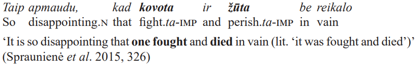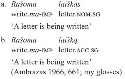 Just as in the Polish no/to construction mentioned above, Lithuanian ma/ta-imp may display an active alignment, where the object of the impersonal construction is in the accusative case, the case of direct objects (19a). However, while in Polish the accusative encoding of the object of no/to impersonals is obligatory, in Lithuanian it is not. In fact, accusative objects of ma/ta-imp are very infrequent: objects appear usually in the nominative case (19b; see. the discussion in Spraunienė et al. 2015, 339–340).
