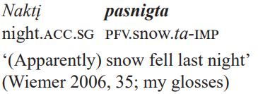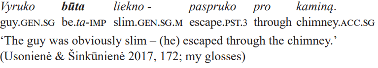 Usonienė, Aurelija & Jolanta Šinkūnienė. 2017. Potential vs use: revisiting an evidential participial construction in Lithuanian. In Evidentiality Revisited: Cognitive Grammar, Functional and Discourse-Pragmatic Perspectives. Juana I. Marín- Arrese, Gerda Haβler & Marta Carretero, eds. Amsterdam/Philadelphia: John Benjamins. 297–340. https://doi.org/10.1075/pbns.271.08uso.