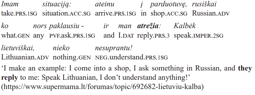 In terms of discourse functions, already Geniušienė (2016, 254) claims that in Lithuanian texts 3-imp are preferably used when the emphasis is on the indefiniteness of the agent and ma/ta-imp when the emphasis is on the action itself. Geniušienė’s claim agrees with the fundamental difference in reference between 3-imp and ma/ta-imp: the first refer to a subgroup of humanity (Sansò 2006, 268), whereas ma/ta-imp can refer to the whole of humanity, a subgroup thereof or even a specific individual, including the speaker. Therefore, 3-imp are eminently suited to encode those situations, where the speaker wants to focus on the fact that the action has been fulfilled by an unspecified ‘someone’. Ma/ta-imp are instead preferred to encode situations where the agent is completely irrelevant: either because it can be anyone or because it is specific but irrelevant to the development of the story. In (33)6, the linguistic competence and behavior of the person, answering in Lithuanian, is the subject of the whole text: the agent, therefore, though indefinite, is focused on. In (34), instead, the emphasis is put on the fact that, no matter what, Americans will get an answer in German; the German-speaking shopkeepers are not relevant to the subsequent narrative development. Similarly, in (35), the co-worker asking the question is irrelevant to the development of the story: what was important to the speaker was the content of the question.
