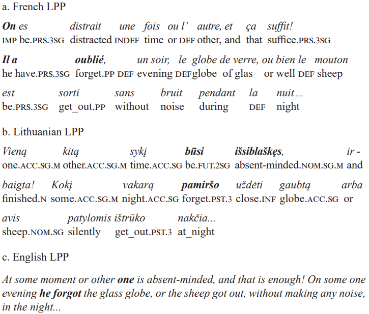 In (27), the author is speaking about the Little Prince, who is referred to by the personal pronoun il ‘he’ in the second sentence. The impersonal construction – on in French, 2sg in Lithuanian – in the first sentence has therefore a clear third person reference.