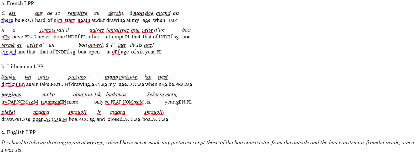 I would like to acknowledge the precious advice I got from Anastasia Bauer, Daniel Bunčić, Maria Katarzyna Prenner, Jogilė Teresa Ramonaitė and Björn Wiemer on different topics discussed in this paper. A thank you goes to Thomas Stolz and colleagues at the University of Bremen for letting me use their corpus of The Little Prince translations. Also, I would like to thank Aurelija Usonienė and two anonymous reviewers for their helpful suggestions and corrections. All remaining errors and shortcomings are my responsability only.