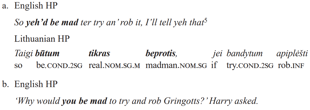 Sometimes, 2sg may be ambiguous between specific 2sg reference and universal, impersonal meaning. Example (29a) is taken from Harry Potter, where a character, Hagrid, addresses directly another one, Harry. Hagrid is explaining to Harry what is the Gringott, the Wizards’ Bank, and the 2sg form may be understood as being at least in part deictic and referential. However, Harry has never expressed any intention to rob the bank: Hagrid’s utterance, thus, must be understood as a generic warning and not one aimed solely at Harry. In fact, later in the dialogue, Harry repeats the question to Hagrid (29b), again in the second person, without switching to the first person, as it would be expected if (29a) would have been a purely deictic form. Therefore, I have counted the instance in (29a) in my corpus as having a generic reference.