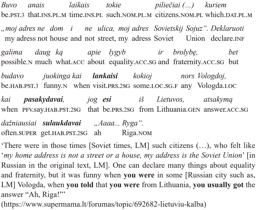 In (31) we have no way of knowing whether the reference to the speaker is real (they have really been in Russia and got such an answer) or simulated (the speaker imagines themselves in a possible situation they relate to emotionally). In any case, the use of 2sg-imp adds to the dramatic/comic effect of the narrative in a way that would be lost with any other strategy; the writer in the forum is using this ‘real life situation’ to make a point: in Russia, people knew about Lithuania much less than the Soviet propaganda would have liked Lithuanians to believe. The switch between the impersonal galima deklaruoti ‘it is possible to declare; one can declare’ and the 2sg-imp of the following predicates clearly marks not a switch in reference itself, but in perspective and inclusiveness: ‘one can declare’ excludes, at least for the argument’s sake, the speaker (who does not agree with what was declared), while ‘you were in some Vologda and […]’ includes them, expressing their true opinion. In (32) the speaker openly declares that the 2sg-imp statement is their opinion: