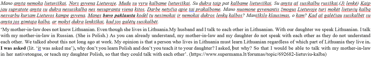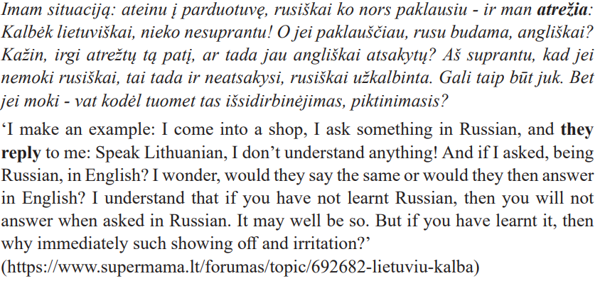 The two original Lithuanian texts are also extremely different. The forum thread “Lietuvių kalba” is about the use of Russian and Polish languages in Lithuania: the main questions of the thread, “Should Russian and Polish speakers learn Lithuanian? Should Lithuanian speakers also speak Russian and Polish, if talked to in these languages?”, generated a very heated and highly emotional debate. The forum texts are written in an informal style, very similar to spoken language. They often do not follow standard orthographic and punctuation rules; sometimes they present ungrammatical constructions (perhaps due to haste in writing), not representative of standard Lithuanian. I have not edited the examples, except I added missing diacritics for ease of reading.